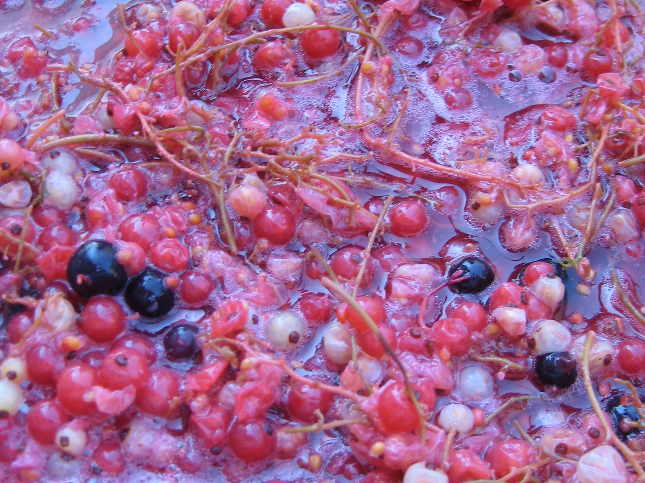 - 4 kilos/8.9 pounds of currants, yielding about 3 liters/3.2 quarts of juice [in our case: 13 kilos, yielding 9 liters/2.4 gallons]